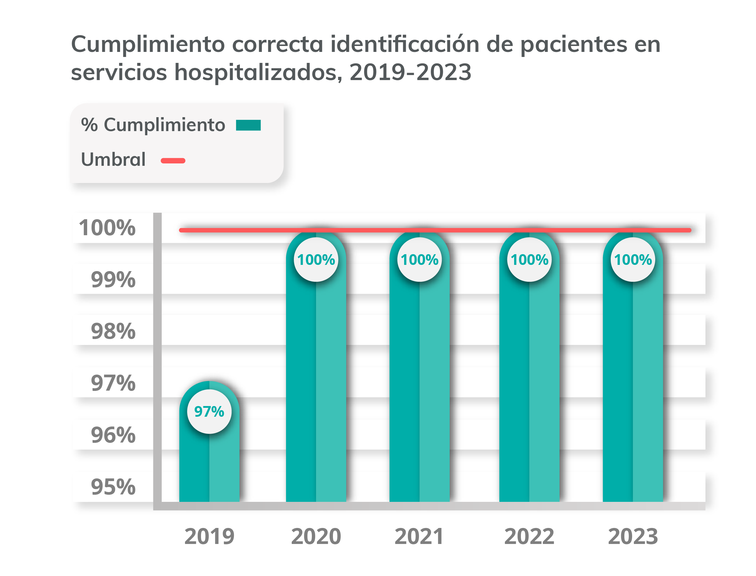 El alto porcentaje de cumplimiento obtenido, da cuenta del constante desarrollo y fortalecimiento en el conocimiento técnico de la correcta identificación de los pacientes, lo que permite llevar a cabo prácticas seguras en todos los integrantes del equipo de salud, con el fin de prevenir la presencia de errores en la atención y disminuir la probabilidad de eventos adversos relacionados