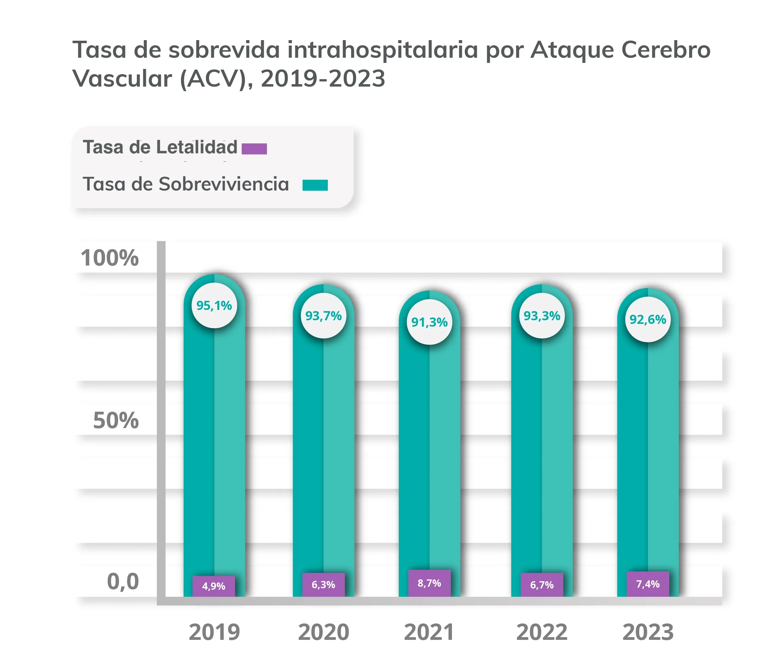 Este indicador refleja el Número de pacientes que sobreviven por ataque cerebro vascular, durante el período de hospitalización, respecto del total de pacientes adultos hospitalizados por este diagnóstico en Clínica Dávila entre los años 2019-2023.