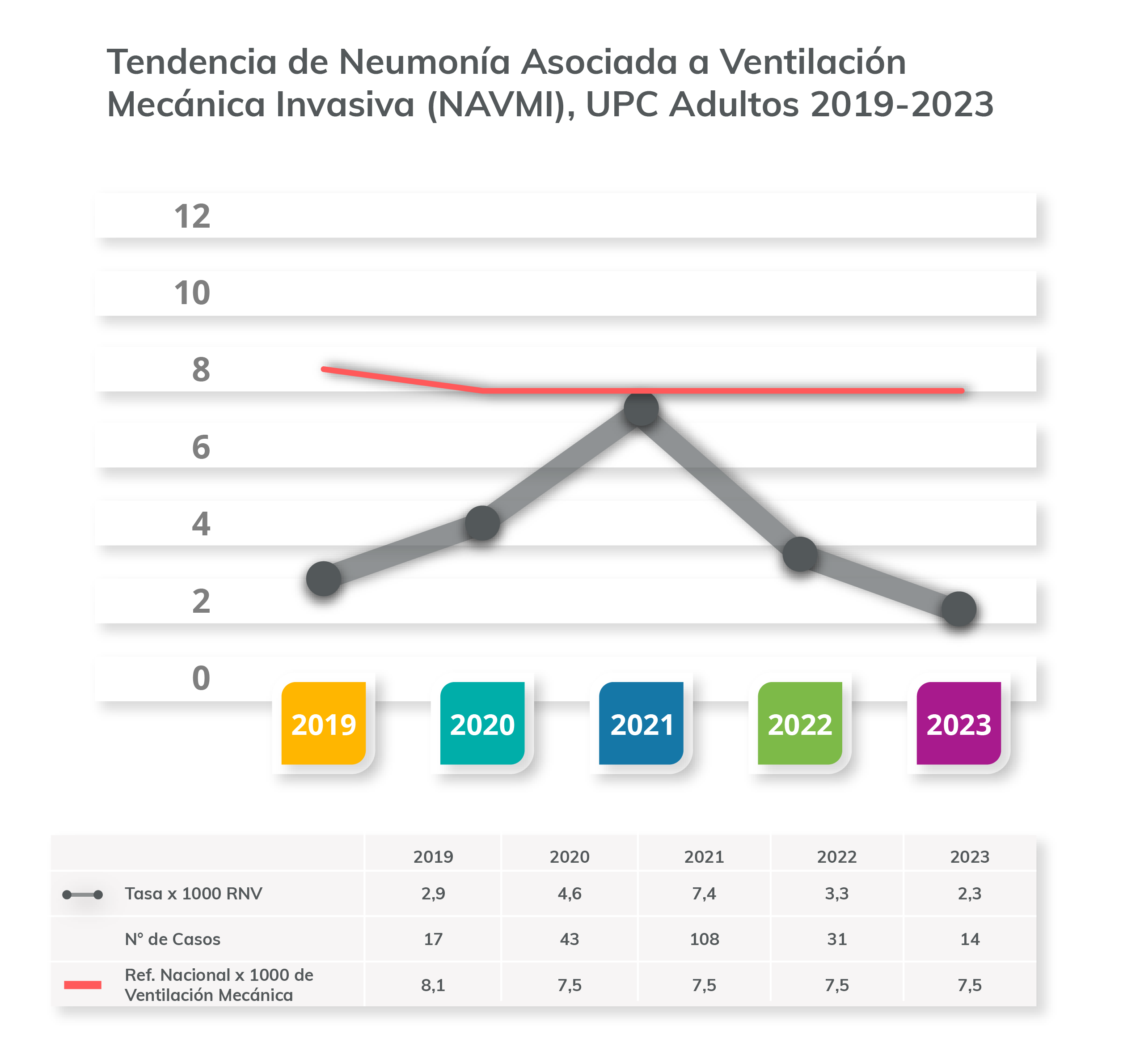 Debido al aumento de paciente con NAVM durante la pandemia de COVID-19, en Clínica Dávila se realizó un plan de intervención para disminuir la tasa NAVM, el cual incluyó revisión bibliográfica, incorporación de insumos, revisión de normativas institucionales, capacitación y supervisión continua con el personal clínico; intervención que desde entonces se mantiene en forma continua.